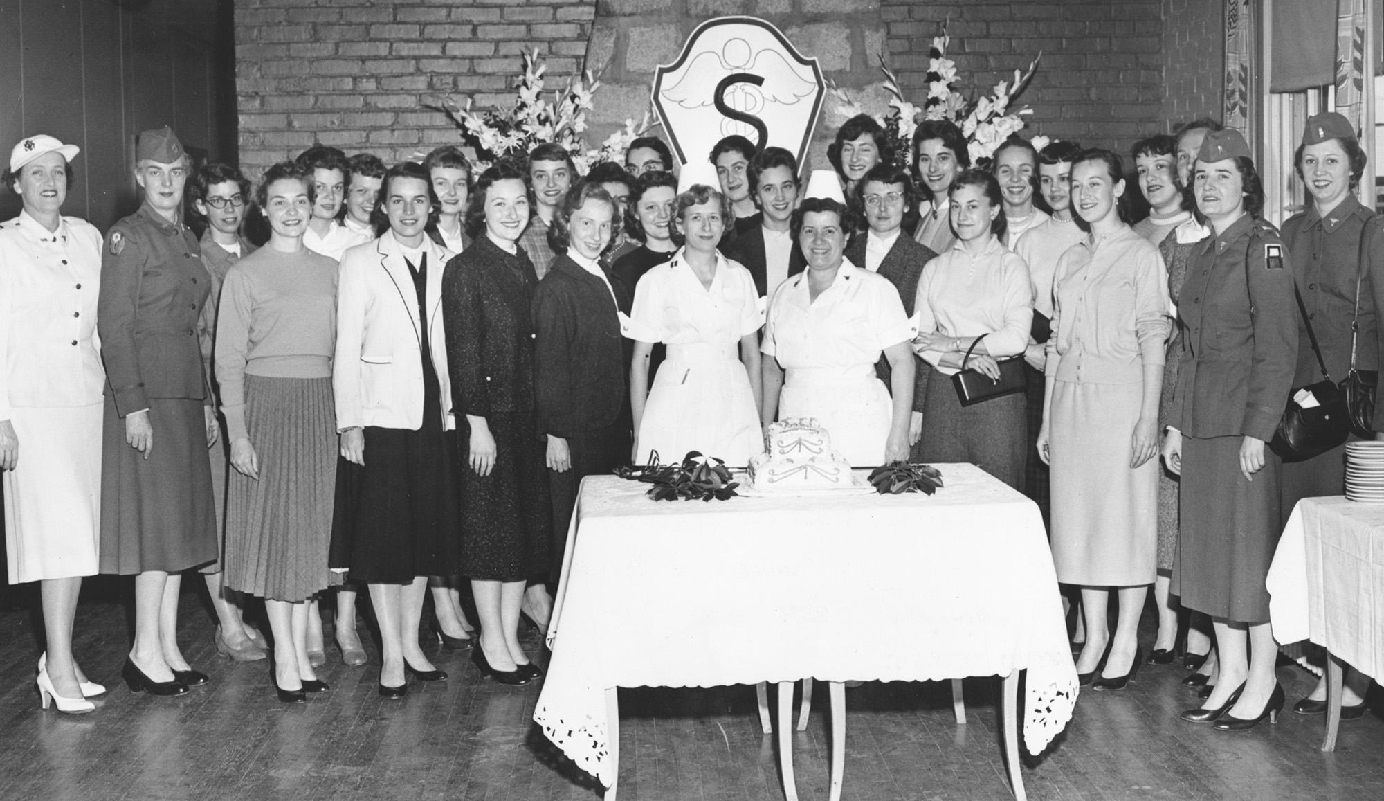 Birthday Party at Murphy Army Hospital: The 10th Anniversary of the Army Medical Specialist Corp…Senior and junior students from the Bouvé Boston School (Tufts College) and School of Physical Therapy, Simmons College were taken for a tour of Murphy by the officers, 1957