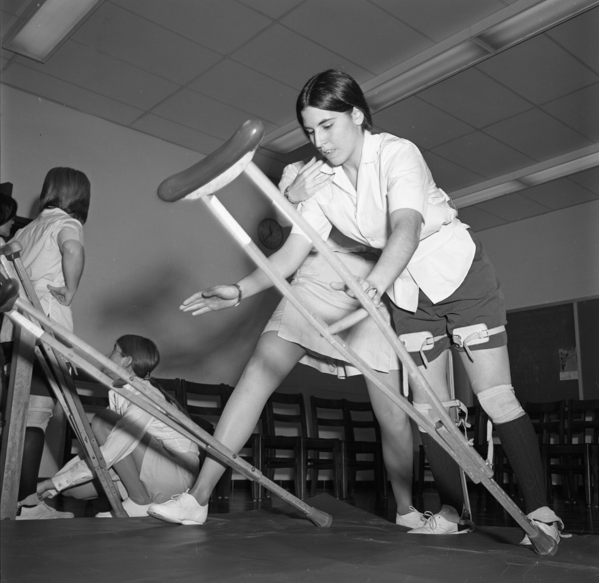 Students inherited new traditions through the School’s merger with Northeastern to accompany the rich body of Bouvé customs and attitudes. Recollections of camp and blue-white competitions shared by alumnae and older students had cultivated strong student allegiances throughout the generations. Physical therapy students shared these traditions with the Northeastern community and extended an ethos of civic responsibility into the neighborhoods around the University by volunteering at community health agencies. Whether fundraising on the quad or organizing events such as a charity wheelchair basketball game, the physical therapy club folded the cares of their profession into the life of the University.